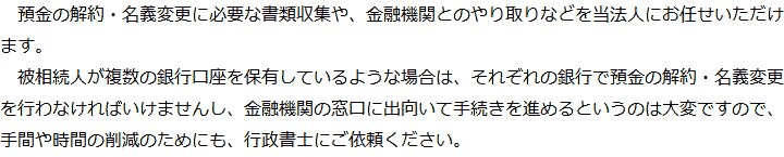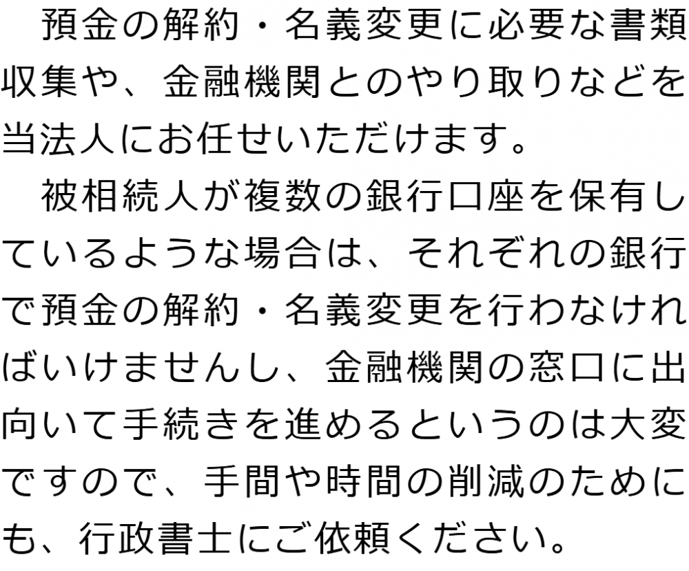 トップ業務内容預金・貯金の解約・名義変更 階層構造▼ 業務内容(目次) 預金・貯金の解約・名義変更 業務内容(目次)業務内容トップ行政書士法人心の業務内容遺言遺産整理相続人調査相続財産調査遺産分割協議書の作成預金・貯金の解約・名義変更証券口座の解約・名義変更自動車の名義変更心グループのその他の業務内容家族信託・民事信託節税対策事業承継遺言の検認相続放棄限定承認遺産分割遺留分侵害額請求相続登記相続税申告相続税調査 受付時間 平日 9時~21時、土日祝 9時~18時 夜間・土日祝の相談も対応します (要予約) 所在地 〒514-0009 三重県津市羽所町345津駅前第一ビル5F 0120-2403-39 お問合せ・アクセス・地図