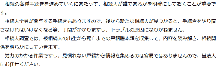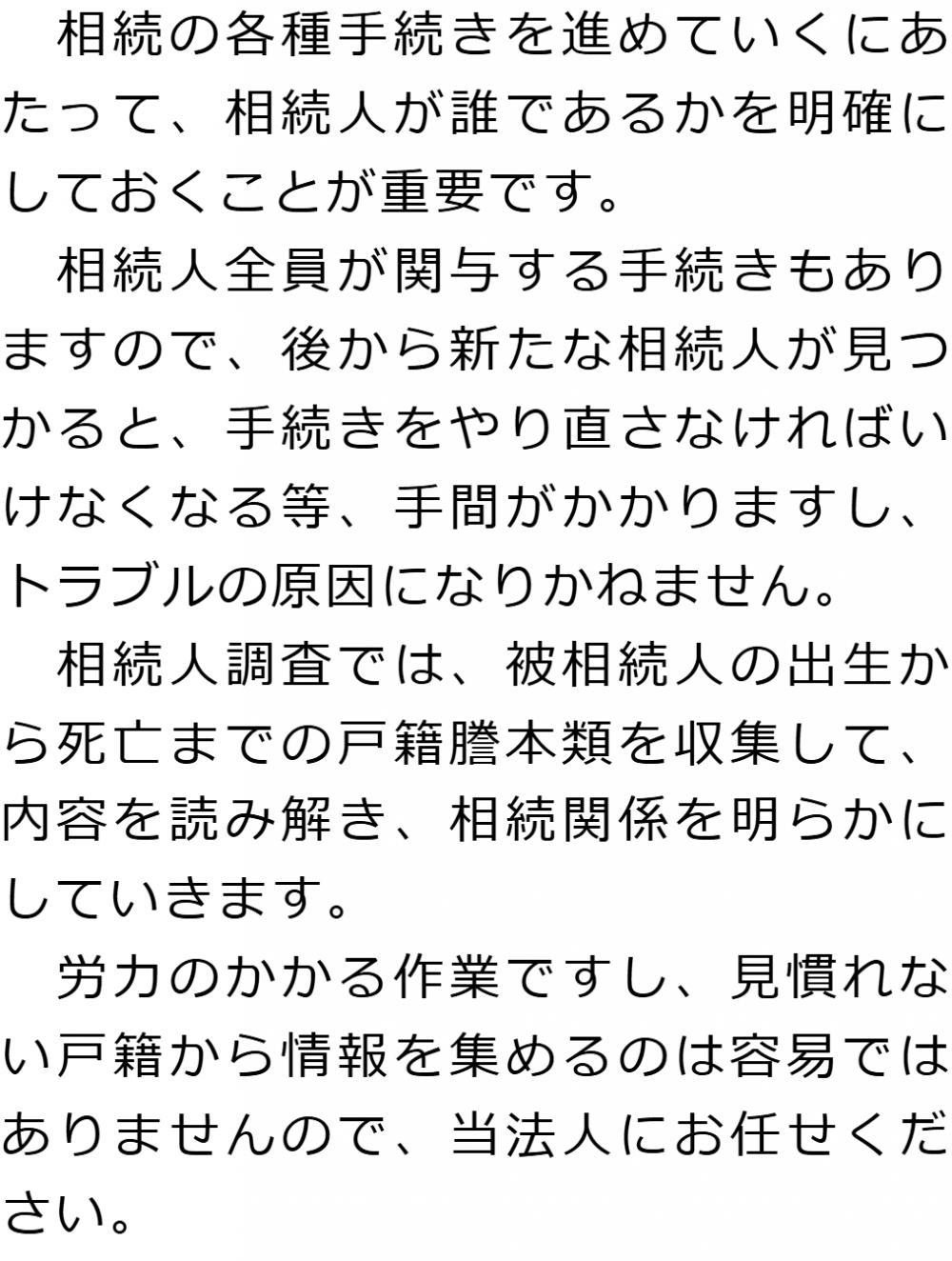トップ業務内容相続人調査 階層構造▼ 業務内容(目次) 相続人調査 業務内容(目次)業務内容トップ行政書士法人心の業務内容遺言遺産整理相続人調査相続財産調査遺産分割協議書の作成預金・貯金の解約・名義変更証券口座の解約・名義変更自動車の名義変更心グループのその他の業務内容家族信託・民事信託節税対策事業承継遺言の検認相続放棄限定承認遺産分割遺留分侵害額請求相続登記相続税申告相続税調査 受付時間 平日 9時~21時、土日祝 9時~18時 夜間・土日祝の相談も対応します (要予約) 所在地 〒514-0009 三重県津市羽所町345津駅前第一ビル5F 0120-2403-39 お問合せ・アクセス・地図