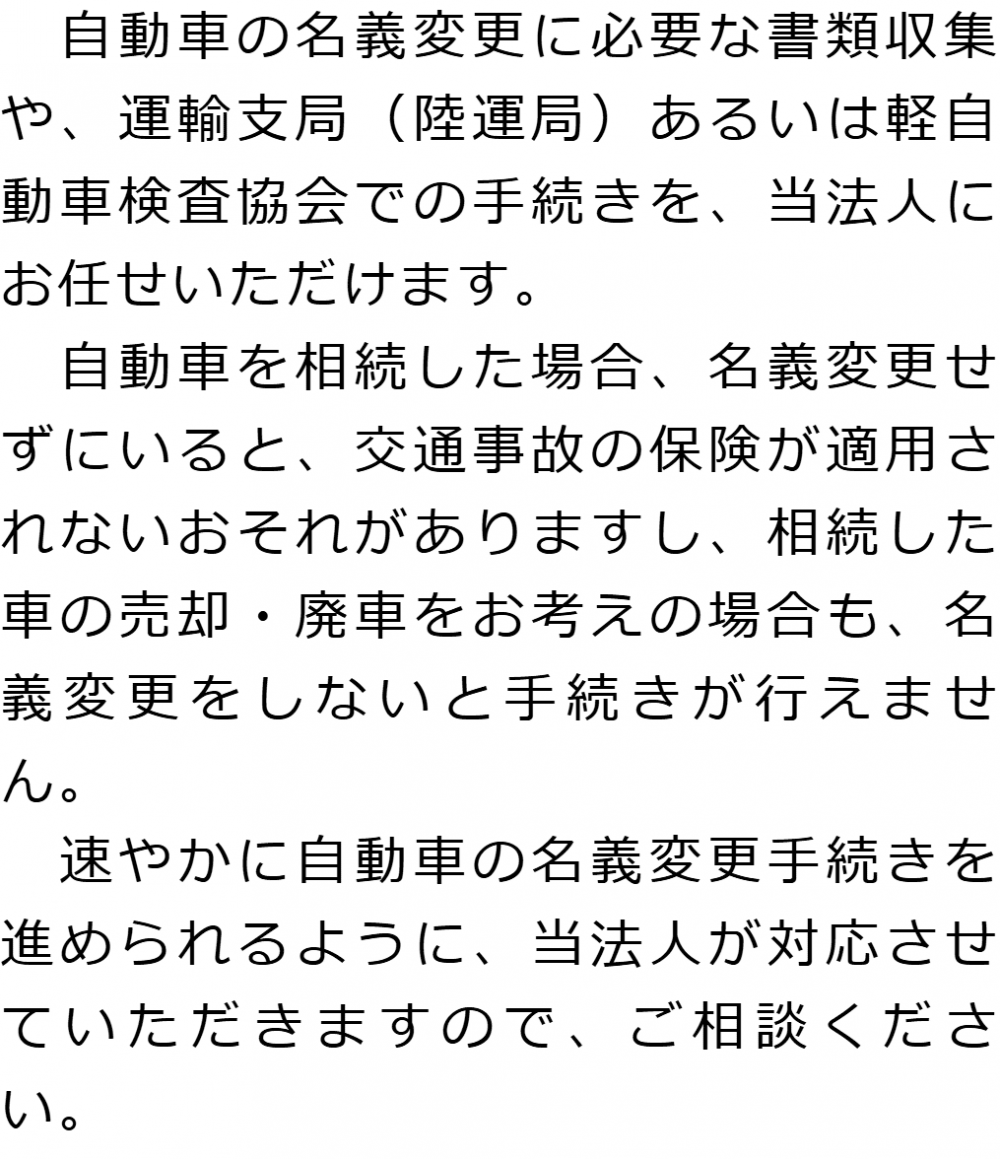 トップ業務内容自動車の名義変更 階層構造▼ 業務内容(目次) 自動車の名義変更 業務内容(目次)業務内容トップ行政書士法人心の業務内容遺言遺産整理相続人調査相続財産調査遺産分割協議書の作成預金・貯金の解約・名義変更証券口座の解約・名義変更自動車の名義変更心グループのその他の業務内容家族信託・民事信託節税対策事業承継遺言の検認相続放棄限定承認遺産分割遺留分侵害額請求相続登記相続税申告相続税調査 受付時間 平日 9時~21時、土日祝 9時~18時 夜間・土日祝の相談も対応します (要予約) 所在地 〒514-0009 三重県津市羽所町345津駅前第一ビル5F 0120-2403-39 お問合せ・アクセス・地図