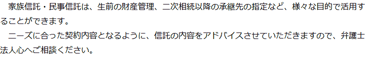 トップ業務内容家族信託・民事信託 階層構造▼ 業務内容(目次) 家族信託・民事信託 業務内容(目次)業務内容トップ行政書士法人心の業務内容遺言遺産整理相続人調査相続財産調査遺産分割協議書の作成預金・貯金の解約・名義変更証券口座の解約・名義変更自動車の名義変更心グループのその他の業務内容家族信託・民事信託節税対策事業承継遺言の検認相続放棄限定承認遺産分割遺留分侵害額請求相続登記相続税申告相続税調査 受付時間 平日 9時~21時、土日祝 9時~18時 夜間・土日祝の相談も対応します (要予約) 所在地 〒514-0009 三重県津市羽所町345津駅前第一ビル5F 0120-2403-39 お問合せ・アクセス・地図