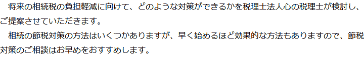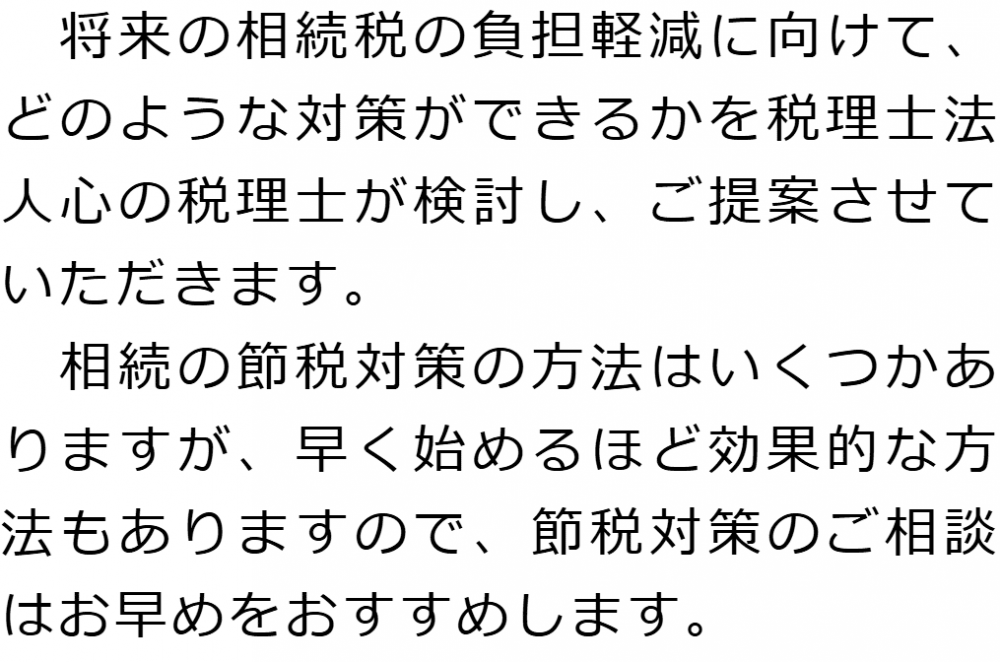 トップ業務内容節税対策 階層構造▼ 業務内容(目次) 節税対策 業務内容(目次)業務内容トップ行政書士法人心の業務内容遺言遺産整理相続人調査相続財産調査遺産分割協議書の作成預金・貯金の解約・名義変更証券口座の解約・名義変更自動車の名義変更心グループのその他の業務内容家族信託・民事信託節税対策事業承継遺言の検認相続放棄限定承認遺産分割遺留分侵害額請求相続登記相続税申告相続税調査 受付時間 平日 9時~21時、土日祝 9時~18時 夜間・土日祝の相談も対応します (要予約) 所在地 〒514-0009 三重県津市羽所町345津駅前第一ビル5F 0120-2403-39 お問合せ・アクセス・地図