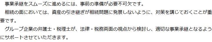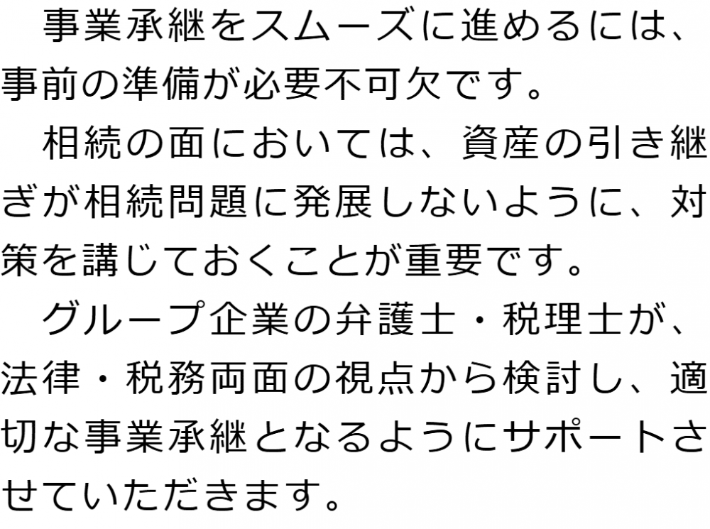 トップ業務内容事業承継 階層構造▼ 業務内容(目次) 事業承継 業務内容(目次)業務内容トップ行政書士法人心の業務内容遺言遺産整理相続人調査相続財産調査遺産分割協議書の作成預金・貯金の解約・名義変更証券口座の解約・名義変更自動車の名義変更心グループのその他の業務内容家族信託・民事信託節税対策事業承継遺言の検認相続放棄限定承認遺産分割遺留分侵害額請求相続登記相続税申告相続税調査 受付時間 平日 9時~21時、土日祝 9時~18時 夜間・土日祝の相談も対応します (要予約) 所在地 〒514-0009 三重県津市羽所町345津駅前第一ビル5F 0120-2403-39 お問合せ・アクセス・地図
