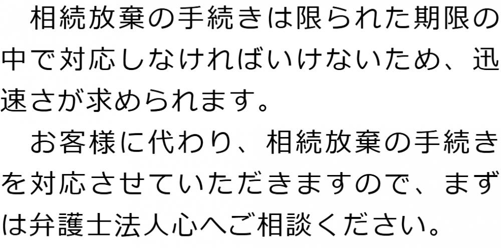 トップ業務内容相続放棄 階層構造▼ 業務内容(目次) 相続放棄 業務内容(目次)業務内容トップ行政書士法人心の業務内容遺言遺産整理相続人調査相続財産調査遺産分割協議書の作成預金・貯金の解約・名義変更証券口座の解約・名義変更自動車の名義変更心グループのその他の業務内容家族信託・民事信託節税対策事業承継遺言の検認相続放棄限定承認遺産分割遺留分侵害額請求相続登記相続税申告相続税調査 受付時間 平日 9時~21時、土日祝 9時~18時 夜間・土日祝の相談も対応します (要予約) 所在地 〒514-0009 三重県津市羽所町345津駅前第一ビル5F 0120-2403-39 お問合せ・アクセス・地図